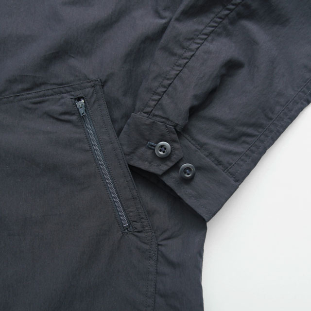 生地はコットン・ナイロンのウェザーを使用。スーピマ綿とナイロンの組み合わせは、コットンの柔らかさとナイロンのドライ感を合わせ持ち、高密の平織りによって、独特なハリ感とツヤ感、しなやかな反発感を持たせています。後加工によって生地にナチュラルなシワ感をつけて、表情をつけながら光沢をほどよく抑えています。