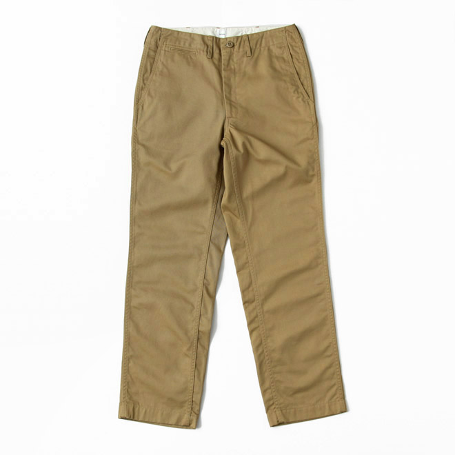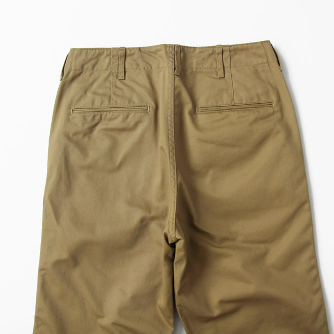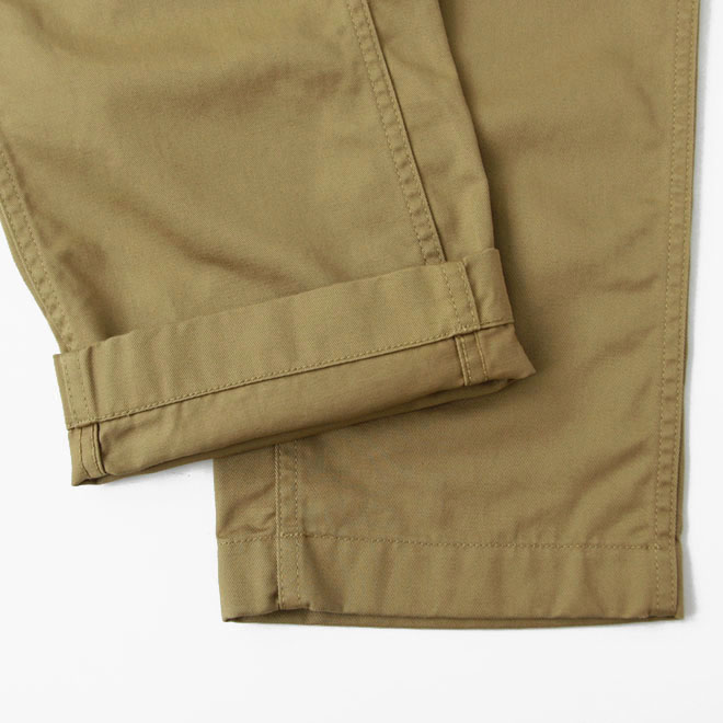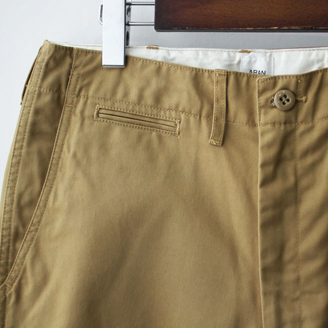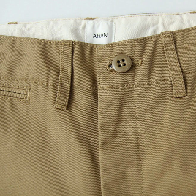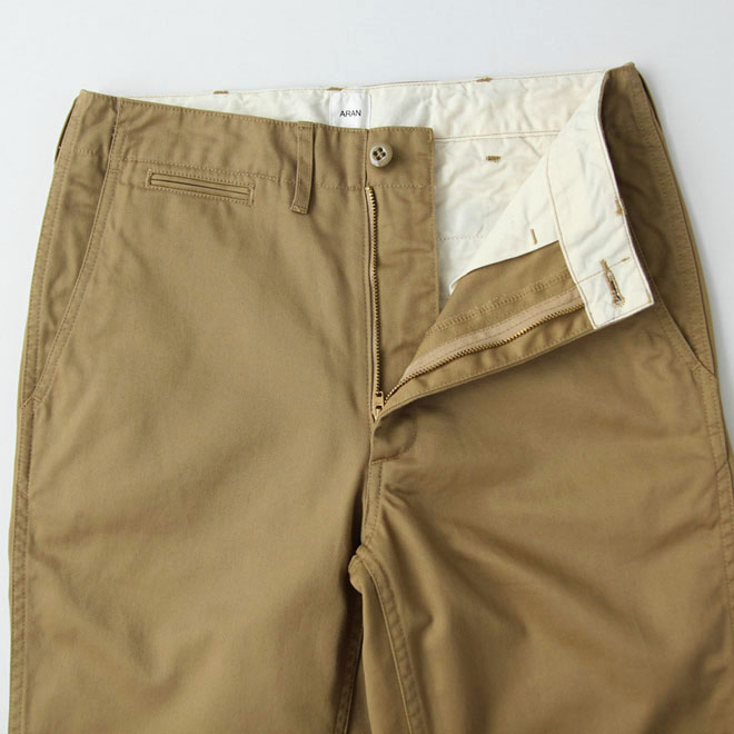 ミリタリーのチノパンをルーツとする正統派の仕様、シルエットは ARAN におけるレギュラーフィットという位置づけです。