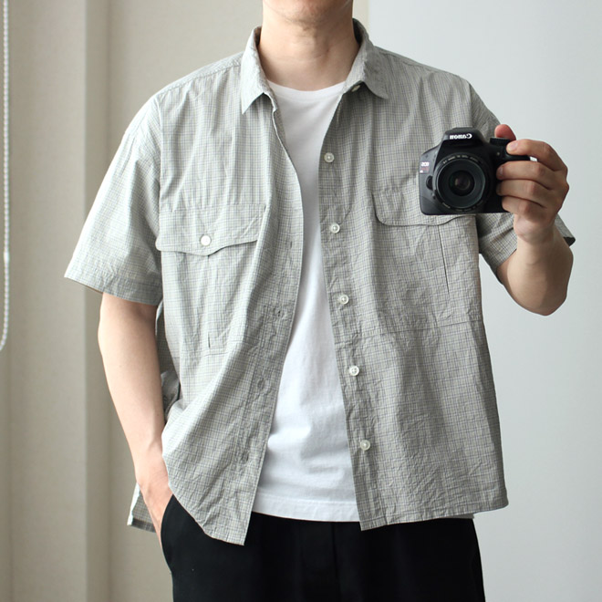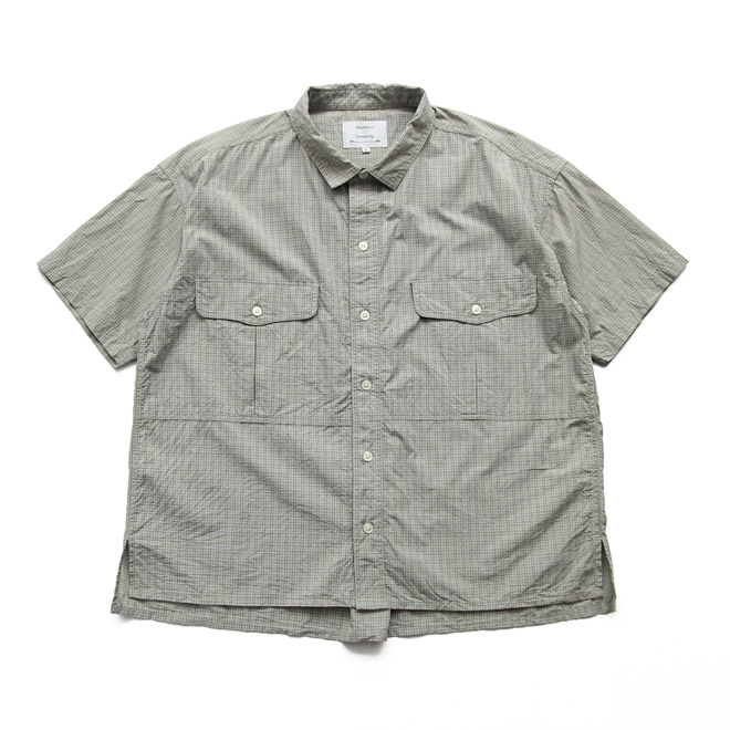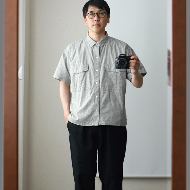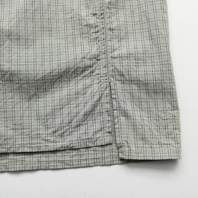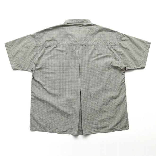 チビ襟、胸のフラップポケット、裾はスクエアカットで、サイドスリットに前後の身頃差、背面センターインプリーツ、カジュアルシャツならではのディテールが散りばめられ、バランス好く着こなせるデザインが秀逸です。
