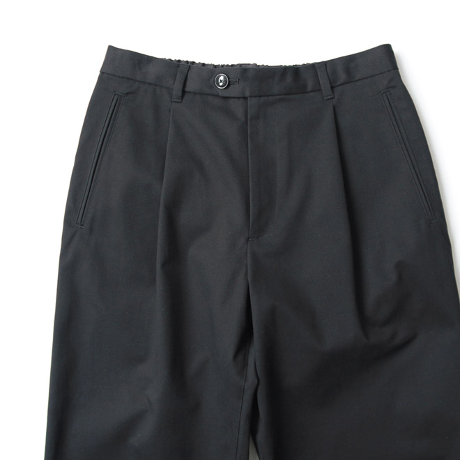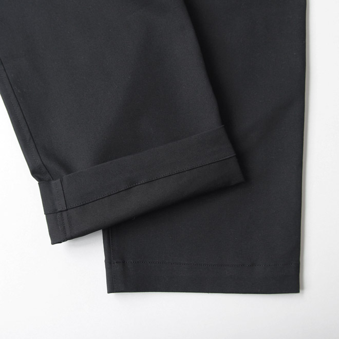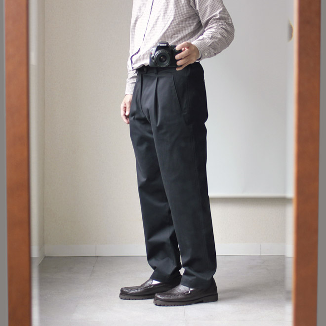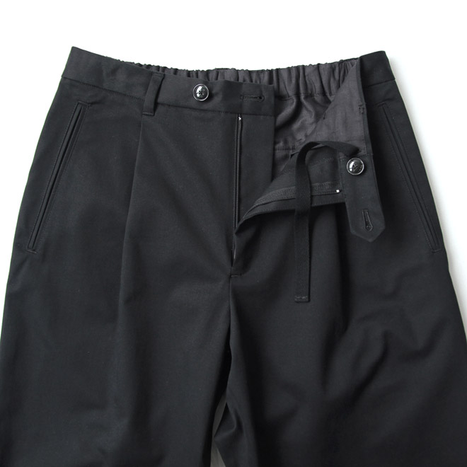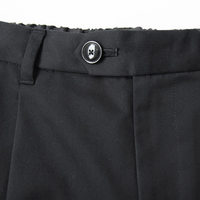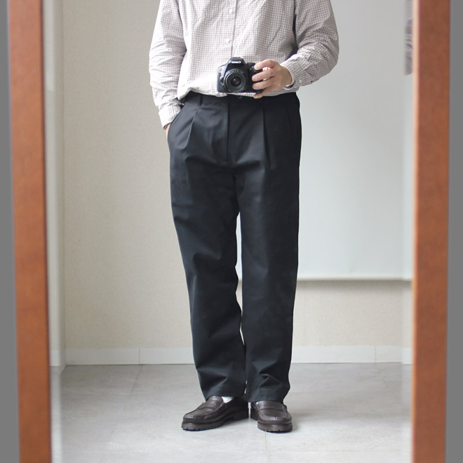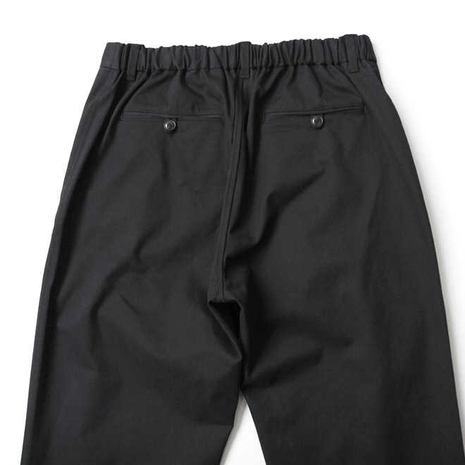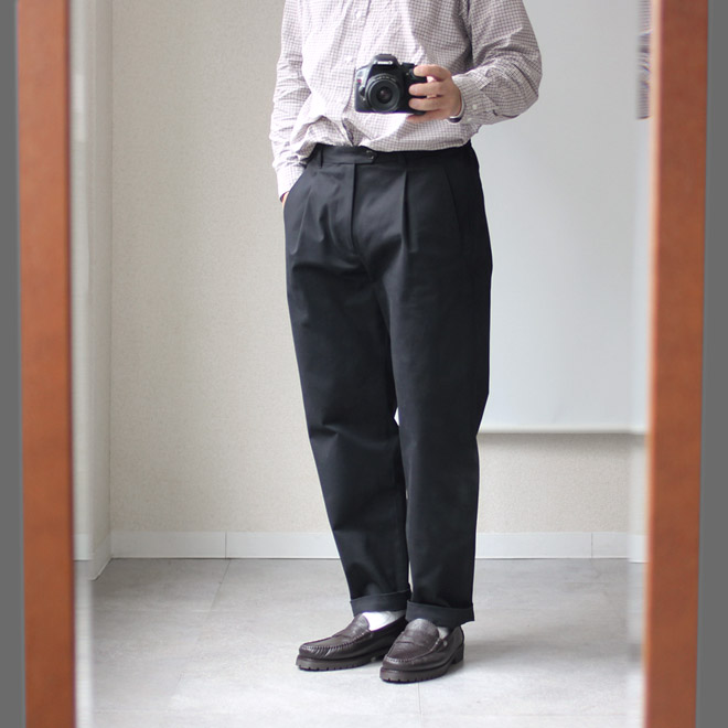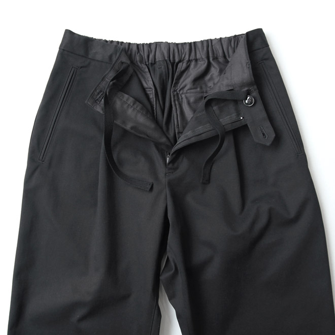 シルエットは定番型のセミワイドの緩いテーパードです。ウエストはバックギャザー+ドローコード+ベルトループ。ベルトをしても、ベルトレスのイージーパンツとしてもお使いいただけます。