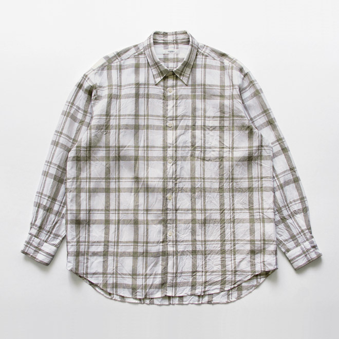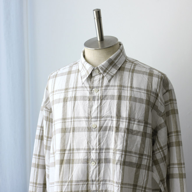 レギュラーカラーで、フレンチフロント(裏前立て)というさっぱりしたディテールに、思い切りのよいオーバーなサイズ感が特徴です。