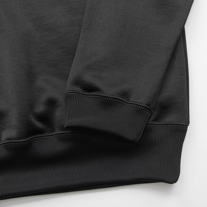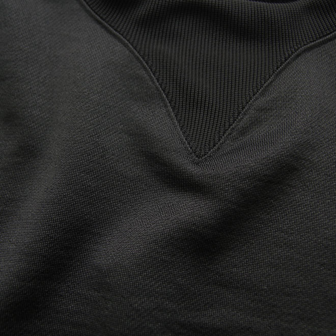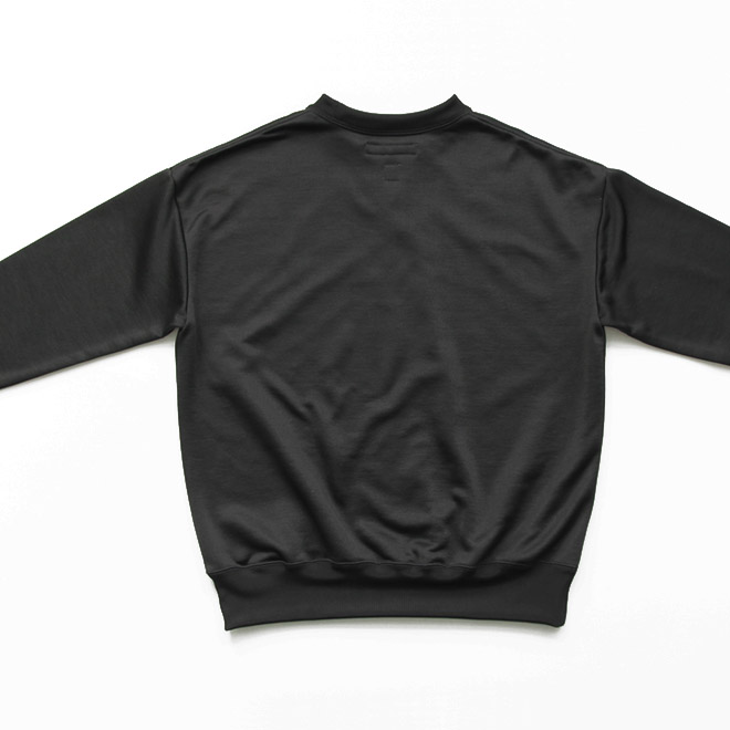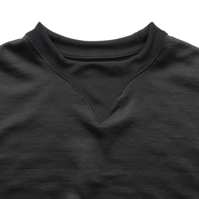 ネックのⅤガゼットを備えたクラシックスタイルのスウェットをアレンジ。ネックからひと続きのリブでVガゼットを表現し、さらにスウェット生地も表面を光沢感のあるものを採用することで、モダンでシティな雰囲気に仕上げています。