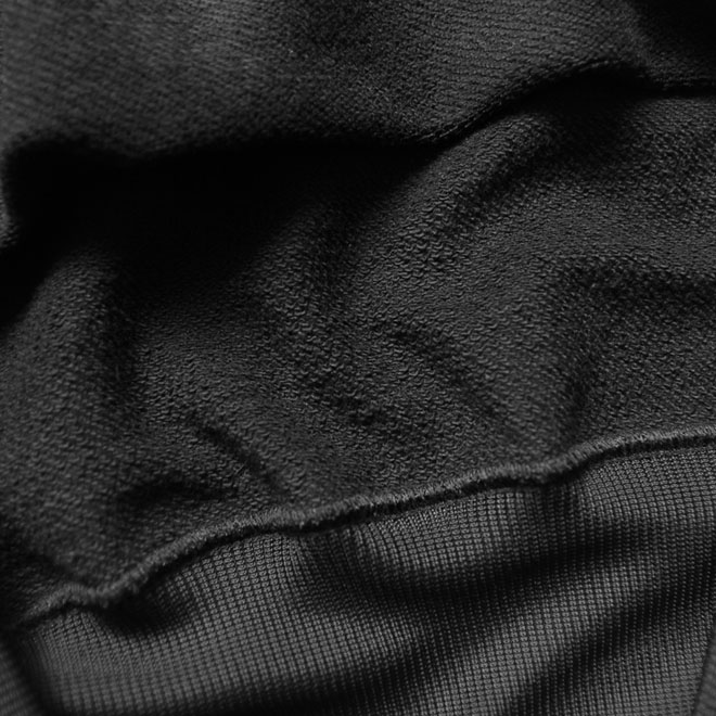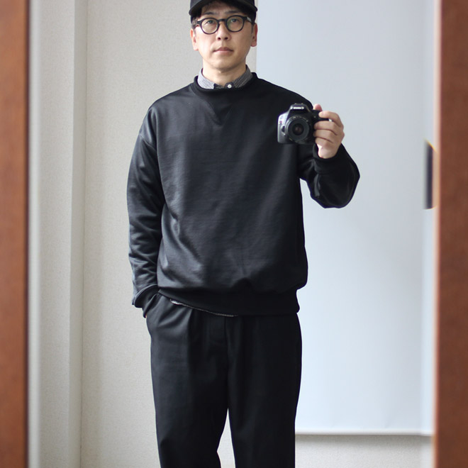 特殊なブライト糸を用いて和歌山で編み立てられたスウェット生地は、表面に光沢感があり、一見するとスポーツ系のジャージ素材のように見えますが、裏パイルのループには太番手のコットン糸を使用しているため、安心感のある着心地と吸水性を備えます。
