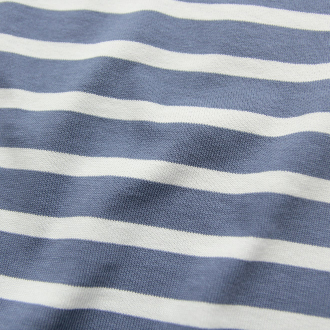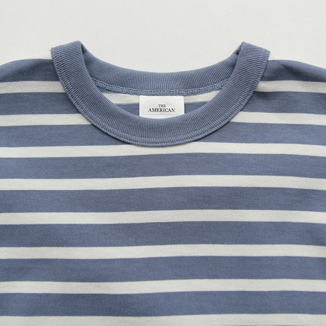 アメリカ産コットンの太番手空紡糸を、引き揃えて度詰めに編み立てたしっかりした生地を使用。ドライタッチでハリコシのあるヘビーな編地は、80年代~90年代のアメリカのカットソー生地をイメージしてつくられました。