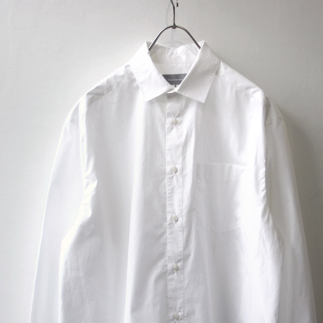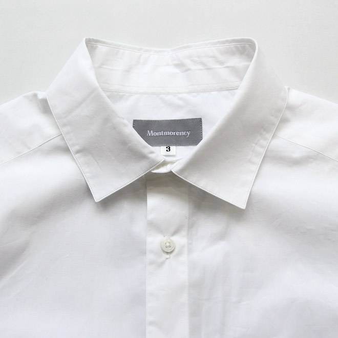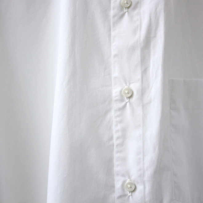 セミワイドのリラックス感のあるレギュラーカラー、ステッチ入りの裏前立て、ゆったりした身まわりと腕まわりのルーズシルエットが特徴です。