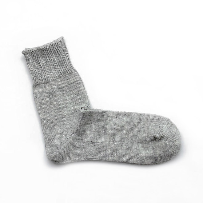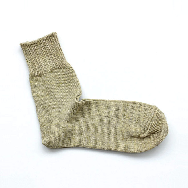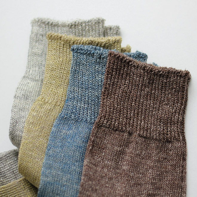 ずり落ちを防ぐための長めのリブの履き口に、ベース部分は締めつけない履き心地の天竺編みの編み仕様。表糸にはリネン100%の糸を使用しています。