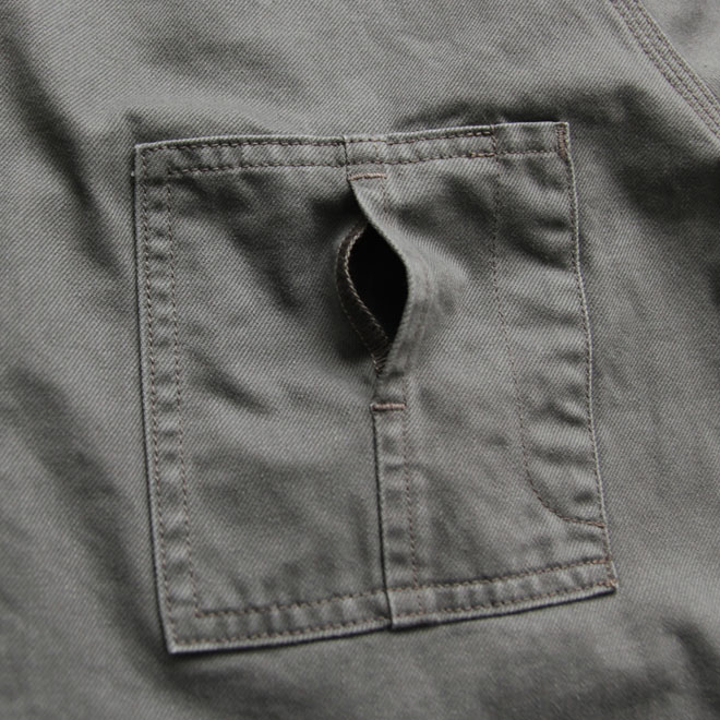 生地はミディアムウエイトのコットンドリル。染料と顔料で二度染めし、フランス軍のパンツに見られる生地のリプロダクションとしてつくられた生地となります。