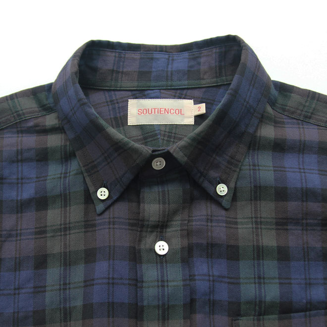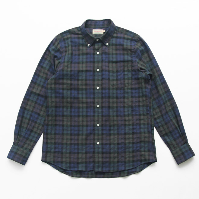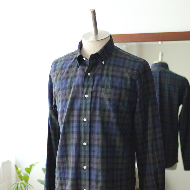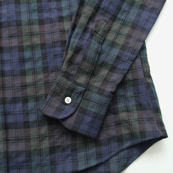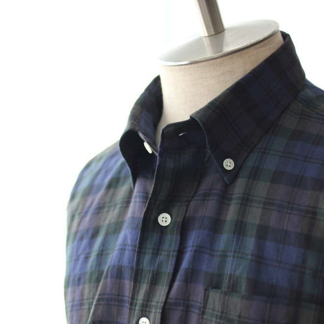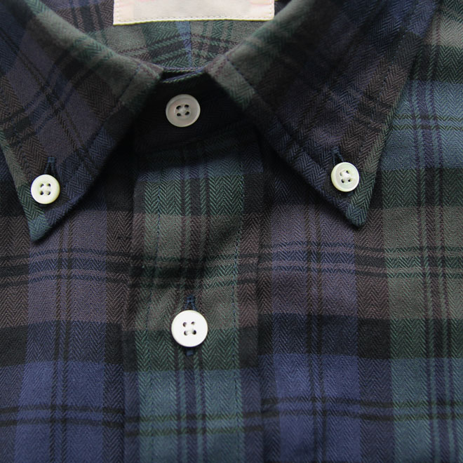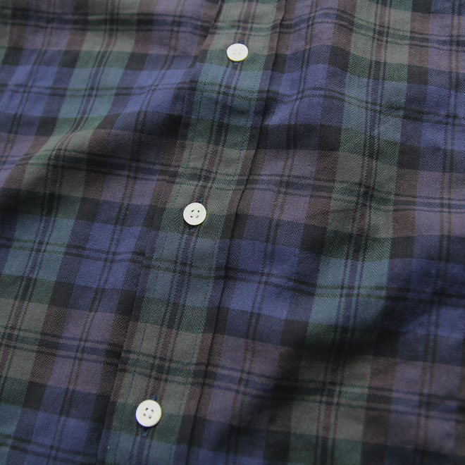 ファブリックはヘリンボーン・シャーリングチェック。シャーリング(波打ち) 加工によりナチュラルな生地感となり、ツイル編みの生地のためソフトな質感と肌触りが特徴です。起毛は無く、地厚も中厚ですが、柔らかで温かみを感じる秋冬の雰囲気です。