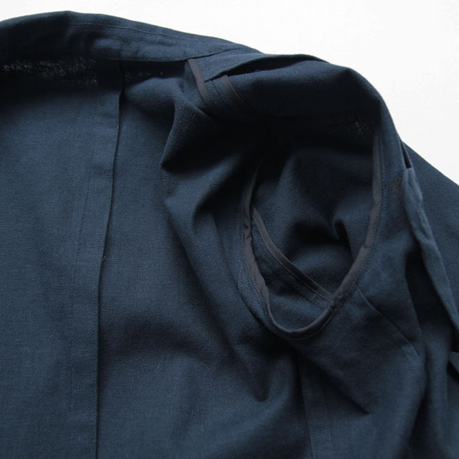 袖裏の付かない裏無し一重仕立てですが、薄地のサマージャケットという薄さ、軽さではなく、しっかり感のある生地となりますので、春時期から晩夏までカバーできる生地感となっています。