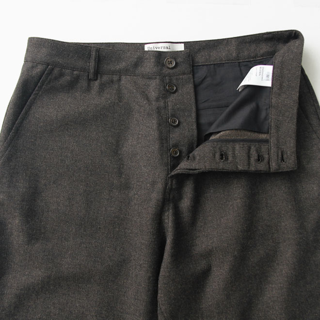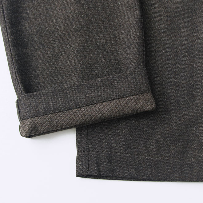 生地はコットン・ウール・化繊を混紡したツイードを使用。クラシカルな梳毛ツイードのルックスで、毛羽感は無く、中厚ミドルウエイト、ソフトな質感の穿きやすい生地となります。
