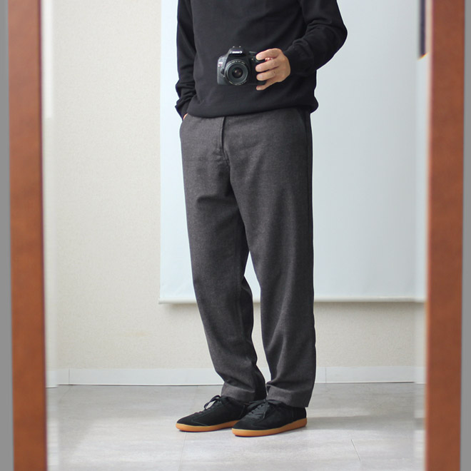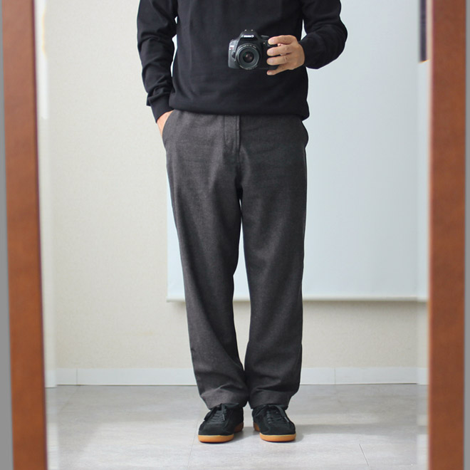 股上は深め、ゆったりした腿まわりから裾にかけてしっかりテーパードを利かせています。穿き感はゆったり、ルックスはすっきりという Universal Works. 的レギュラーフィットとなります。