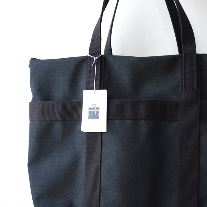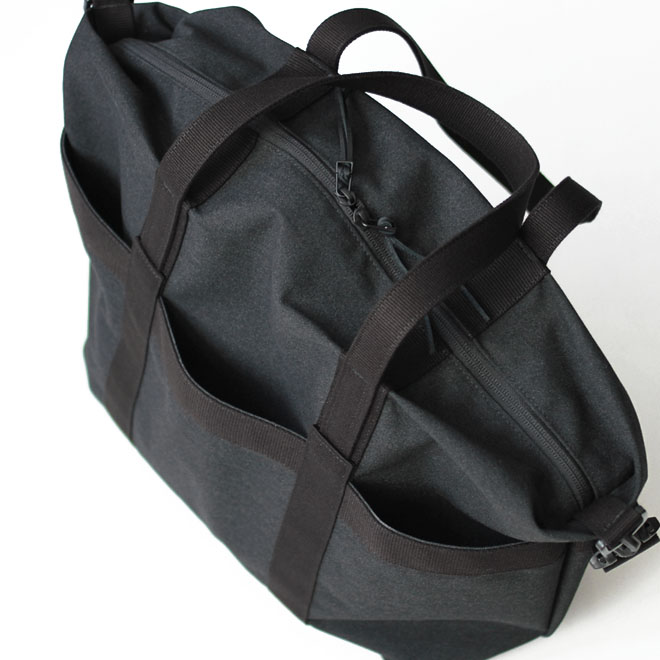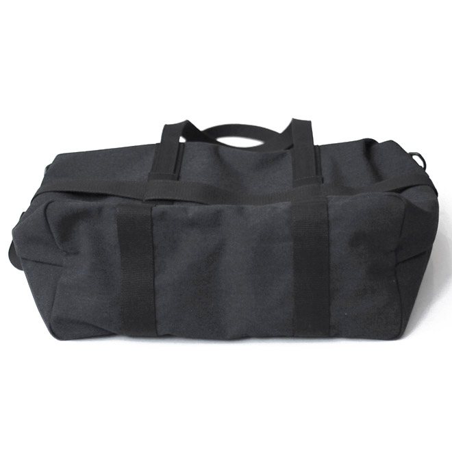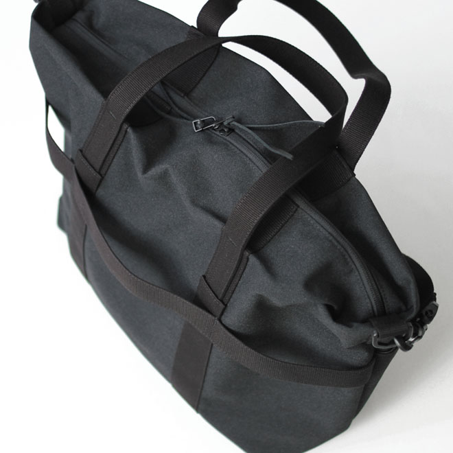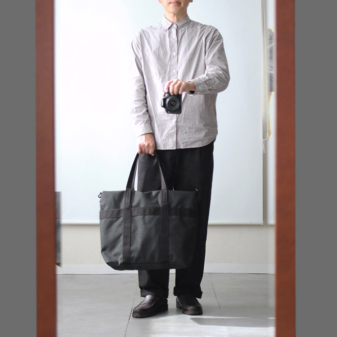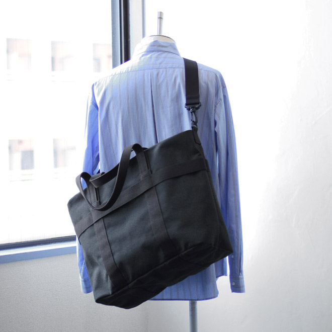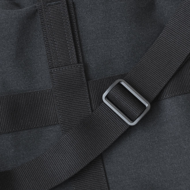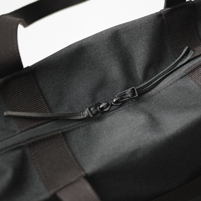 ファブリックは旧式シャトル織機によって織られたポリエステルキャンバス。適度な中厚地で微かに杢調の表情が見られ、化繊ならではの軽さと耐久性を備えます。表面に撥水加工も施され、シワになりにくく、適度な立体感をキープしながら使用するようイメージされています。
