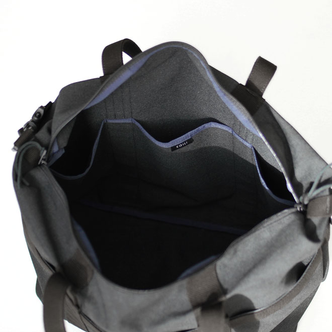 ポリエステルキャンバスということで、バッグそのものが軽いというのも大きな特徴と言えます。強度や撥水性能も必要充分なので、トータルで見ても実用的という印象ですが、実用一辺倒のカタブツにならないのが KaILI の魅力であろうと思います。