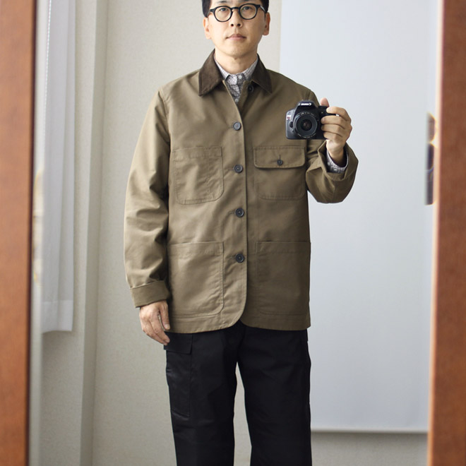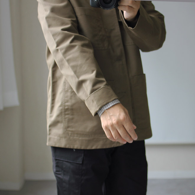 シルエットはややゆったりしたフィットながら、概ねスタンダードなバランスと言える範囲です。肩は窮屈になり過ぎず、でも肩線は落とさず、胴まわりは適度にゆったり、というクラシックなカバーオールのスタイルとなっています。