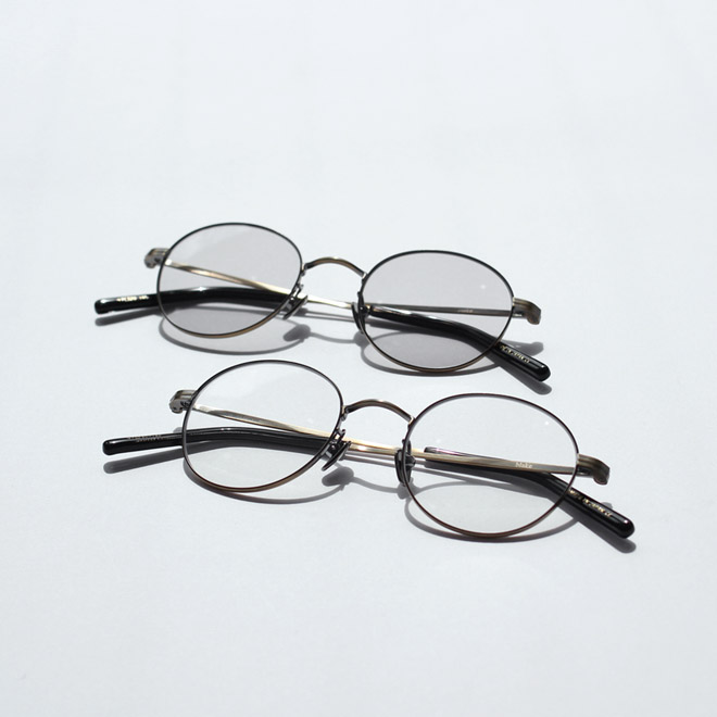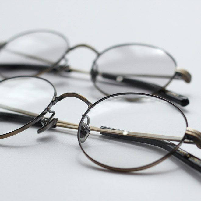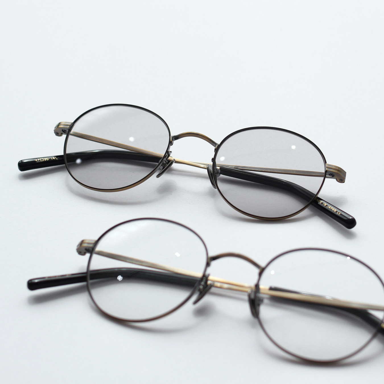 今回はフレームカラーはアンティークゴールドを選び、クリアレンズとサングラスレンズでご用意しました。このモデルのサングラスレンズは、薄めのグレーカラーで、クセの無い渋い雰囲気です。