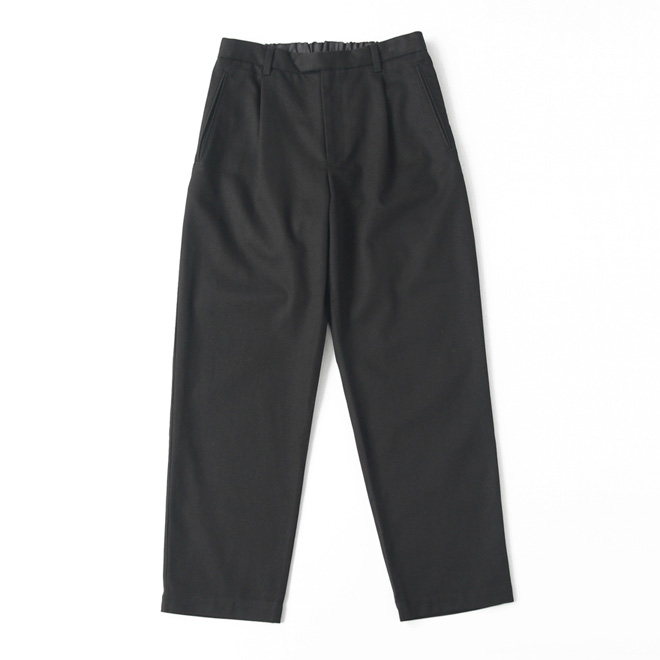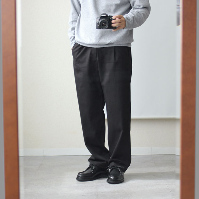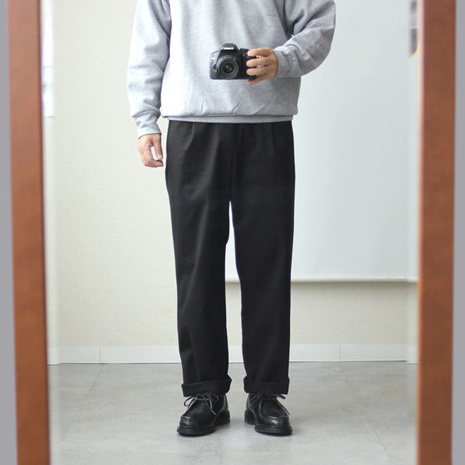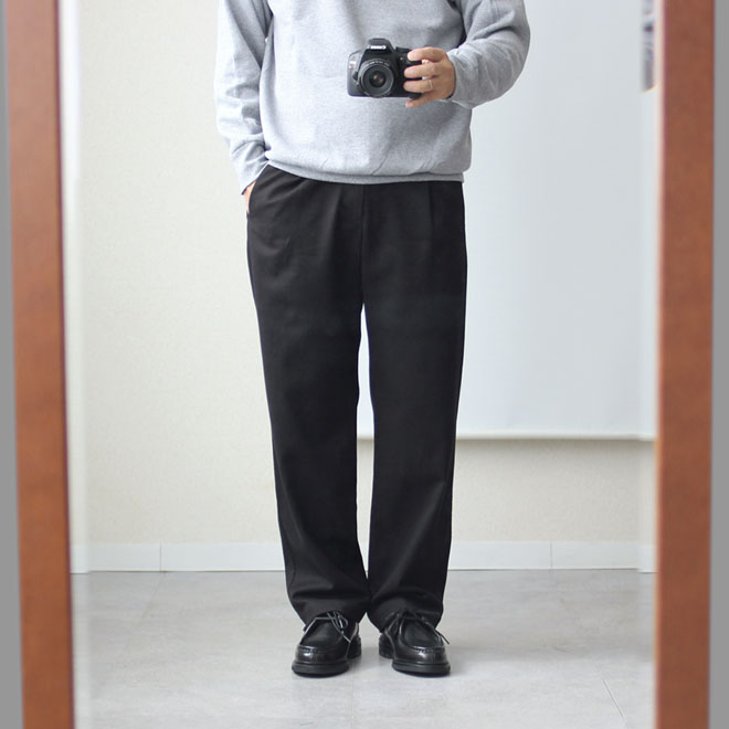シルエットは定番型のセミワイドの緩いテーパードです。ウエストはバックギャザー+ドローコード+ベルトループ。ベルトをしても、ベルトレスのイージーパンツとしてもお使いいただけます。