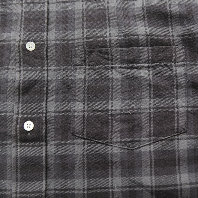 生地はコットン・シルク素材のグレーチェック。繊維くずをネップにしたノイル生地となりますので、古着のような毛羽感、ネップ感のあるテクスチャーも独特の魅力です。