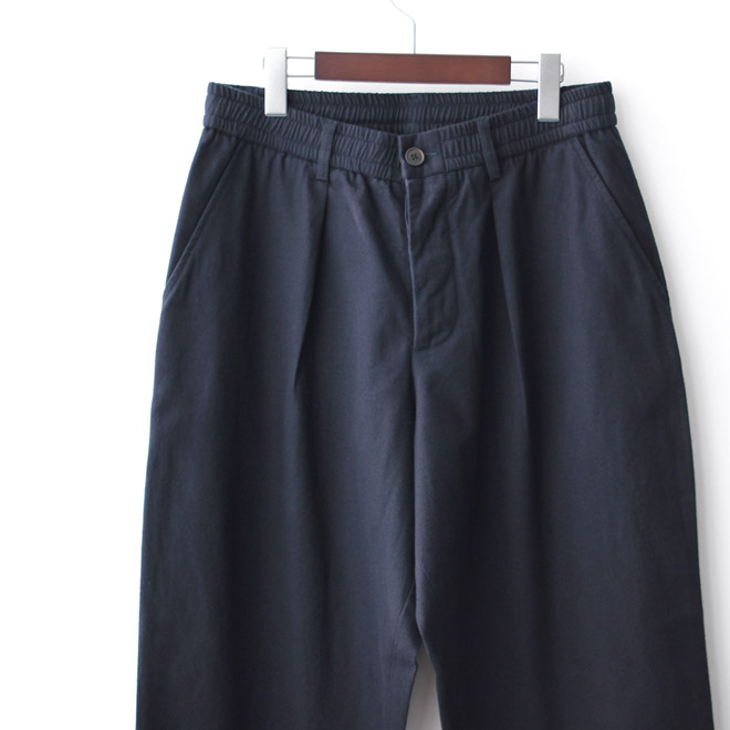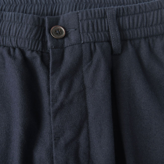 インプリーツのワンタック入り、フロントはボタンフライ、ウエストはゴム+ドローコード+ベルトループでイージーパンツとしても穿ける仕様です。
