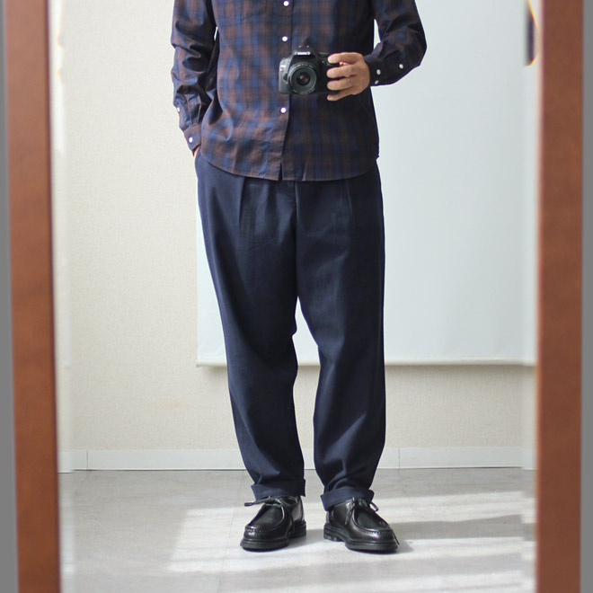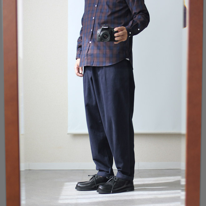 やや深めの股上、ゆったりした股まわりにゆるやかなテーパードラインを描く、全体にボリュームをもたせたワイドテーパードシルエットです。