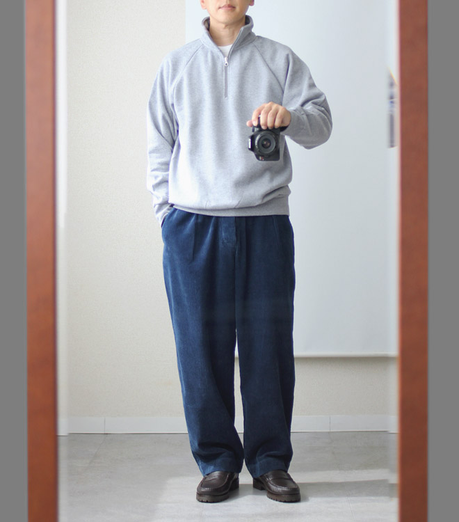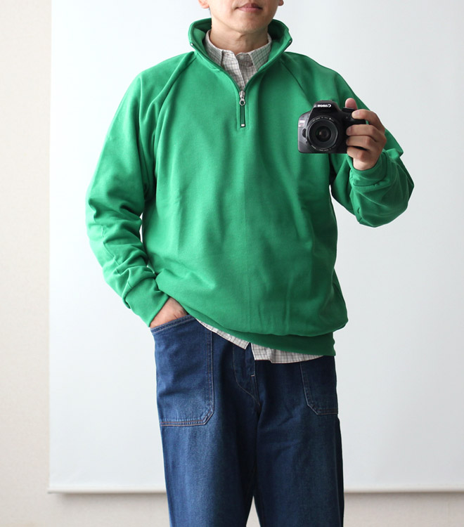 VESTI のハーフジップのスウェットは、単体でも、インでも使いやすいです。