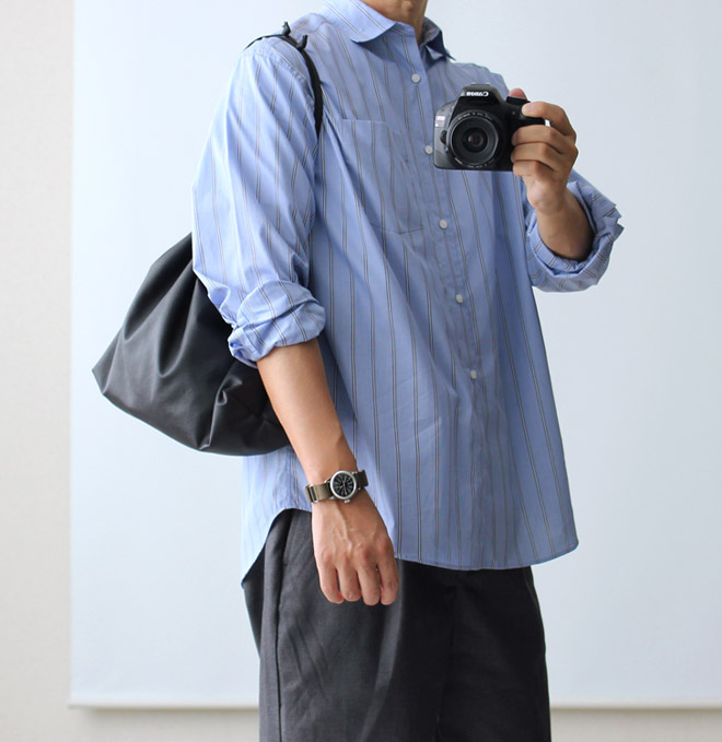 Montmorency のストライプのシャツは、トラッド柄のカジュアルフォルムです。マジメ過ぎず、ラフ過ぎず、こぎれいに軽やかに、というイメージです。グレーのパンツやオリーブの軍パンなど、意外と合わせやすく、コーディネイトで印象もガラリと変わるのがトラッド柄の楽しいところです。