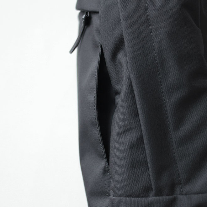 外装のポケットは、ファスナー付きの大きなポケットに加え、左右から手を差し込める “ゲームポケット”を装備しています。ゲームポケットは、ハンティングジャケットやハンティングバッグからの着想で、ファスナーやボタン無しでそのまま手を差し込んで物を出し入れするポケットです。バッグを背負ったまま手を伸ばして、ポケット内部にアクセスすることが可能です。