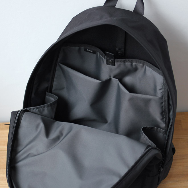 内装は、ドリンクホルダー2つ、PCスリーブ(Mac Book Pro 14インチ)、メッシュのファスナー付きポケット、さらに2つの小さな区分けポケットを装備。メイン室には前後2つの取り出し口があることも大きな特徴となっており、背面側の口からはスムーズにパソコンや書類、あるいはメッシュポケットに入れた小物などを取り出せる構造になっています。