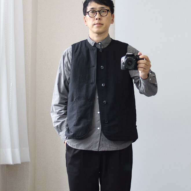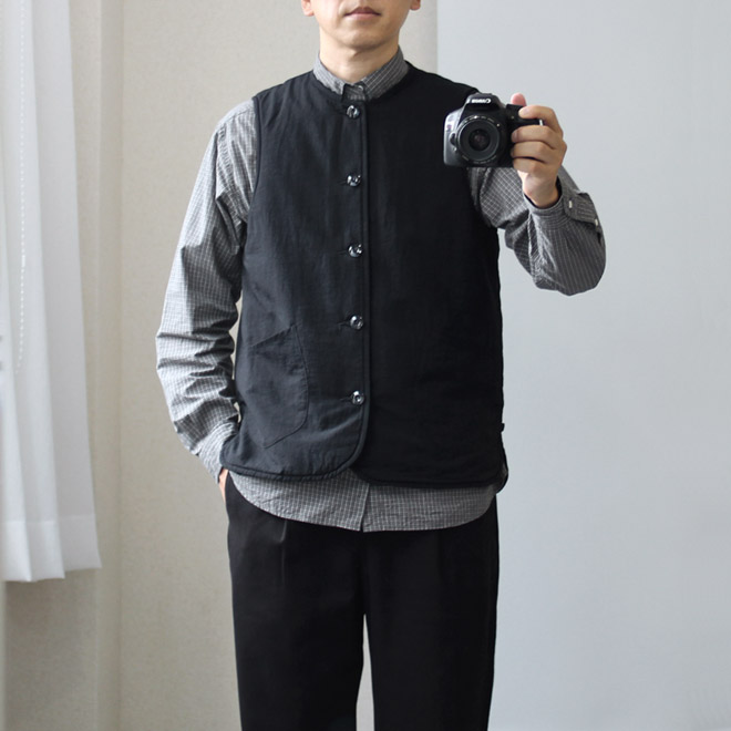 したがいまして、余計なことを考えず、フラットな感覚でコーディネイトに使える便利さも嬉しいポイントだと思います。ベストというアイテムは、案外思想が強く出てしまいがちで、sometimesそんなに引っ張らないでよ、と思うことがあったりもしますから、このベストの無宗教感は万能感とつながっているような気がします。
