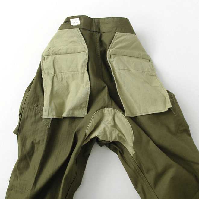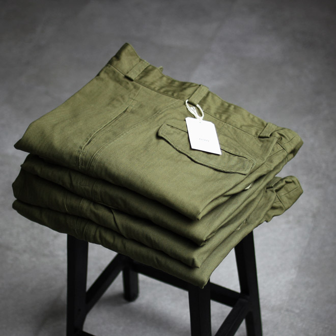 通称『ベイカーパンツ』とも呼ばれるUSミリタリーの作業用パンツがモチーフとなりますが、この FATIGUE 46 はボリューム感を適度に抑え、ほんのりとテーパードを利かせたアレンジモデルとなります。