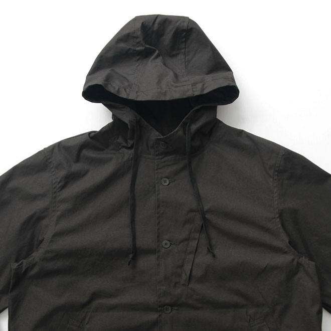 シンプルなボタンジャケットに一体型フードを備えた総裏地ジャケットです。
