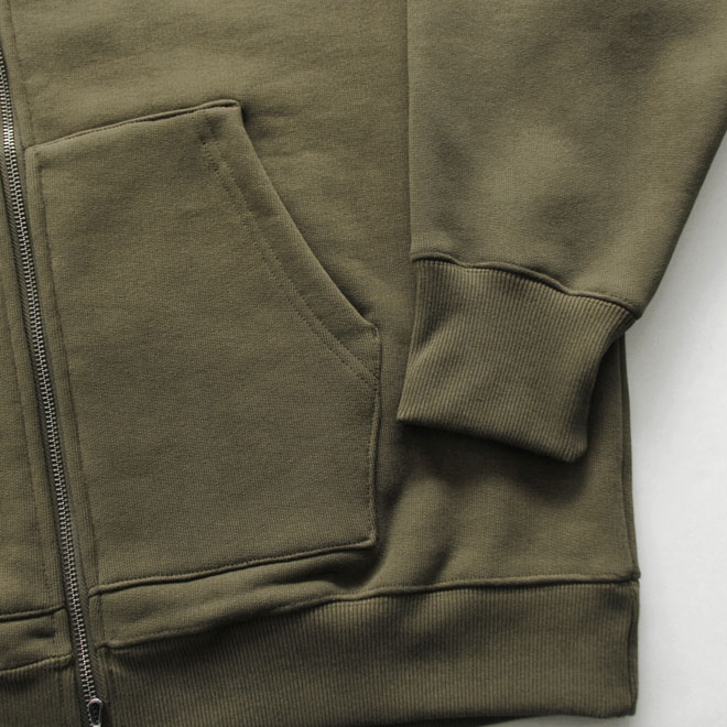 ずっしり重いスウェット地に、カンガルーポケット付きでフルジップ。