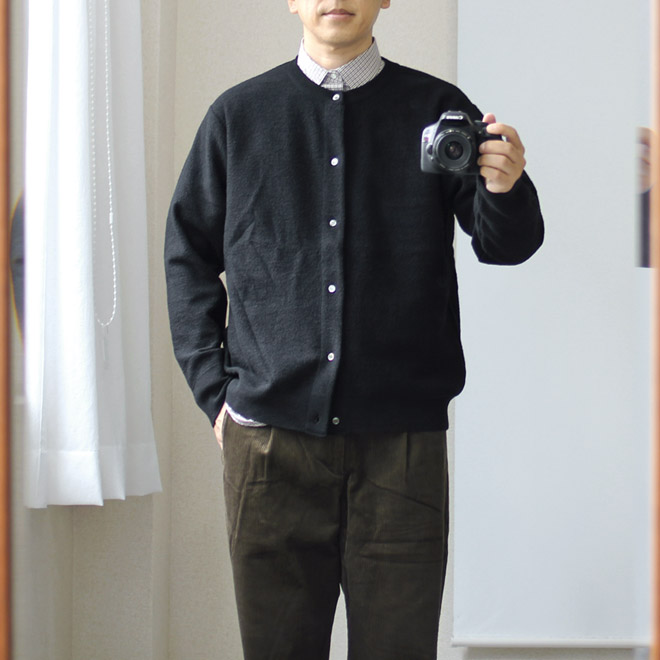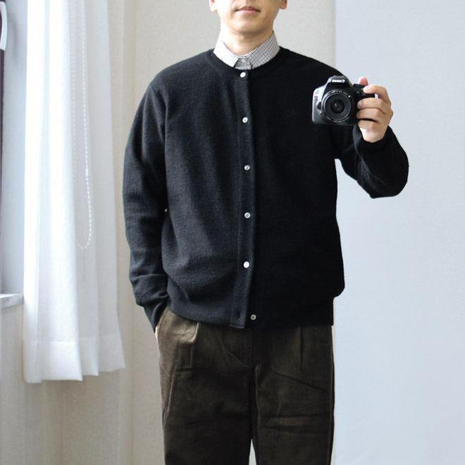 Vカーディガンと比べると、メンズでは丸襟の方が圧倒的に機会が少ないと思いますし、着こなしのニュアンスも微妙に異なるように思います。