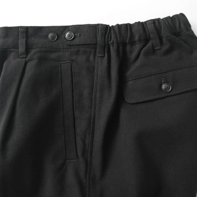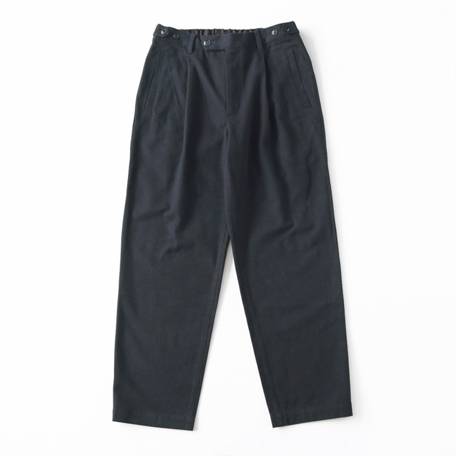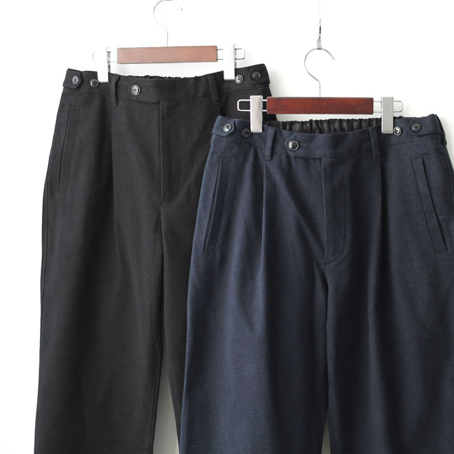 シルエットは定番型のセミワイドの緩いテーパードです。ウエストはバックギャザー+ドローコード+サイドアジャスタータブ+ベルトループ。ベルトをしても、ベルトレスのイージーパンツとしてもお使いいただけます。