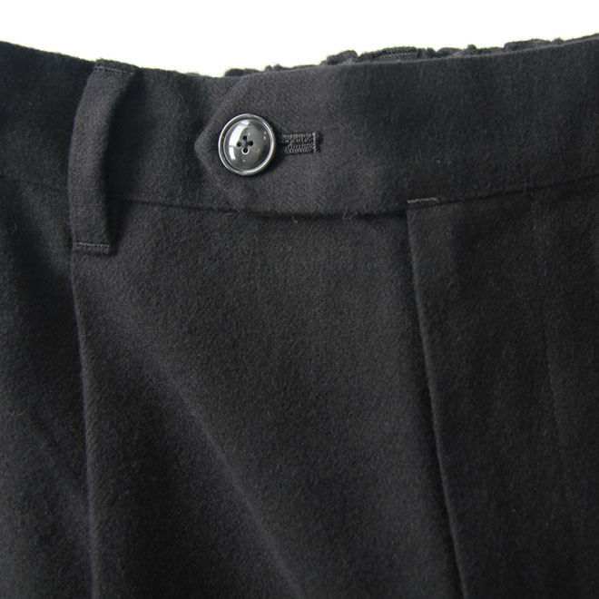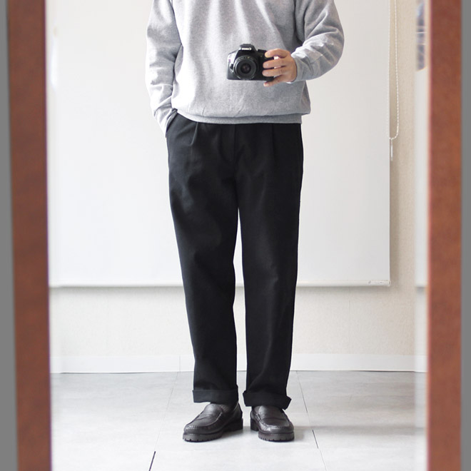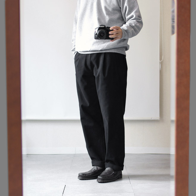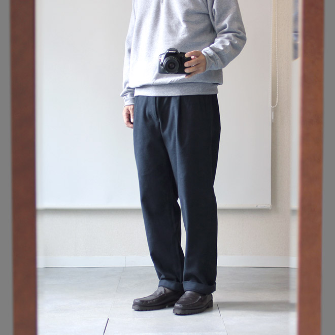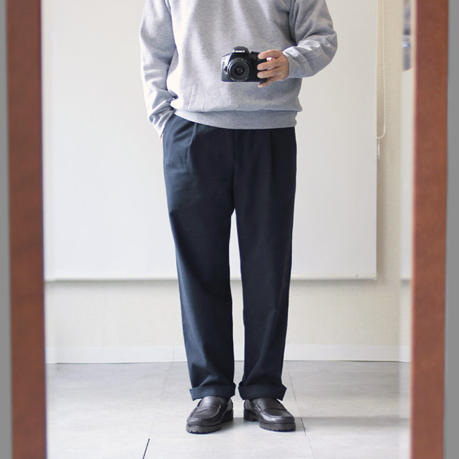 いつものごとく、ベルトが有りでも無しでも穿ける仕様になっていて、シルエットは中太の緩いテーパードです。