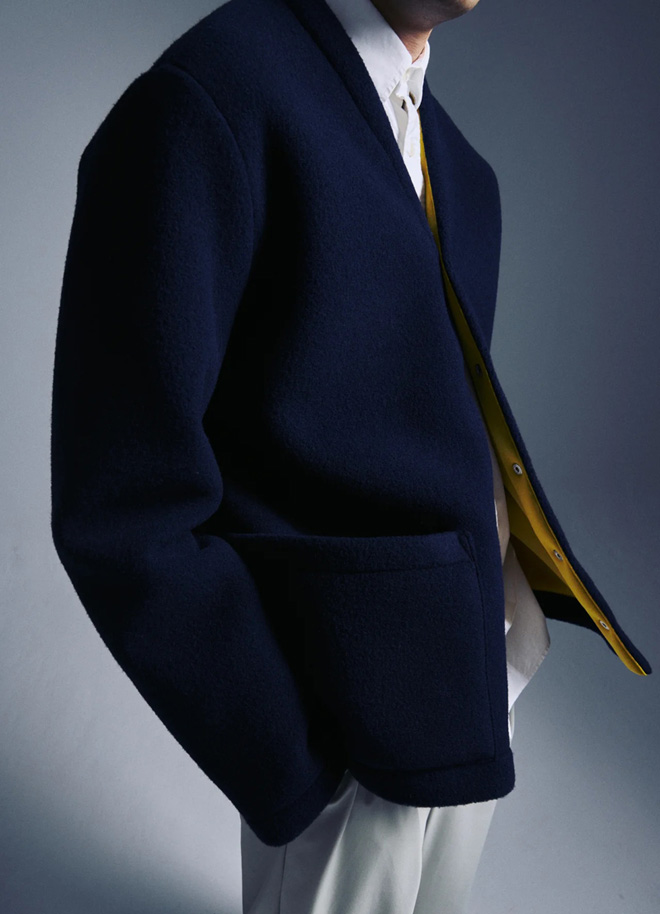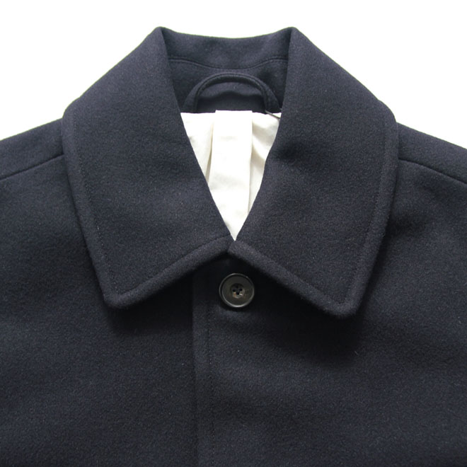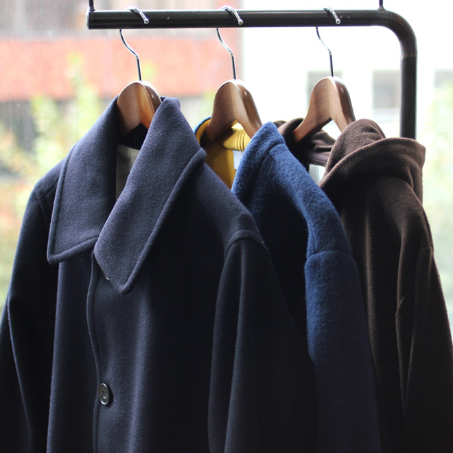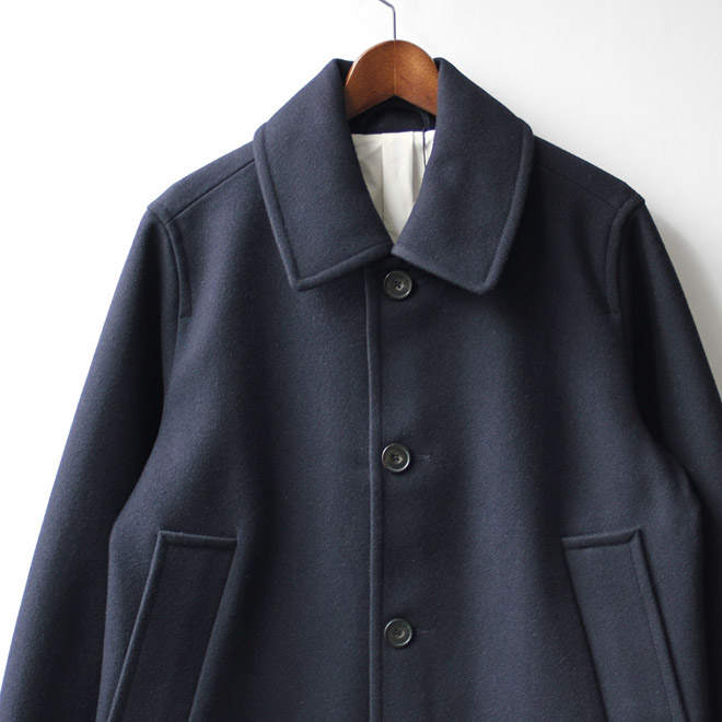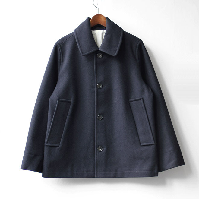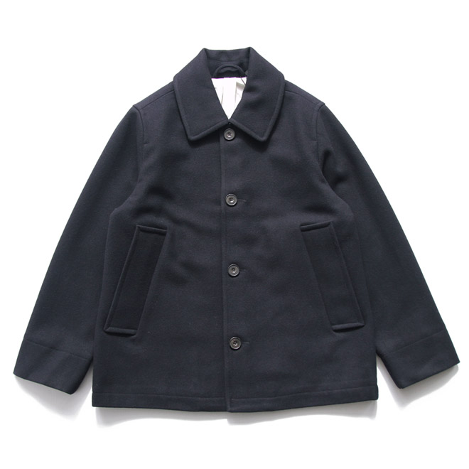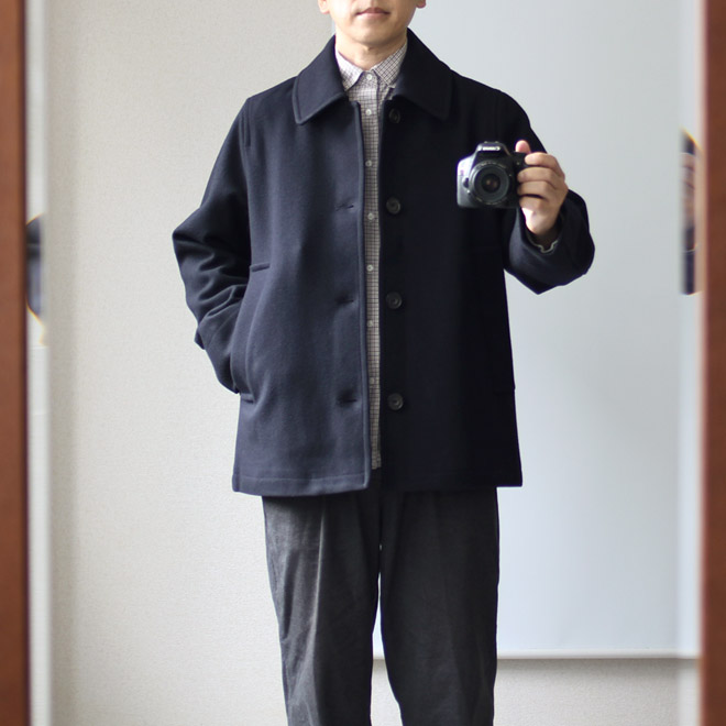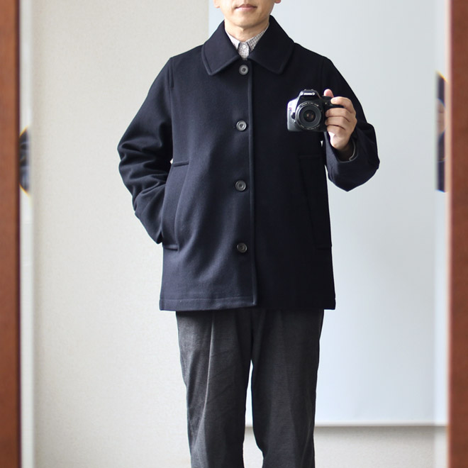 クラシックなPコートをベースに、シンプルなシングルブレスト、ジャケット丈でアレンジされています。