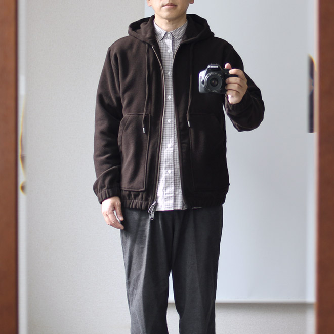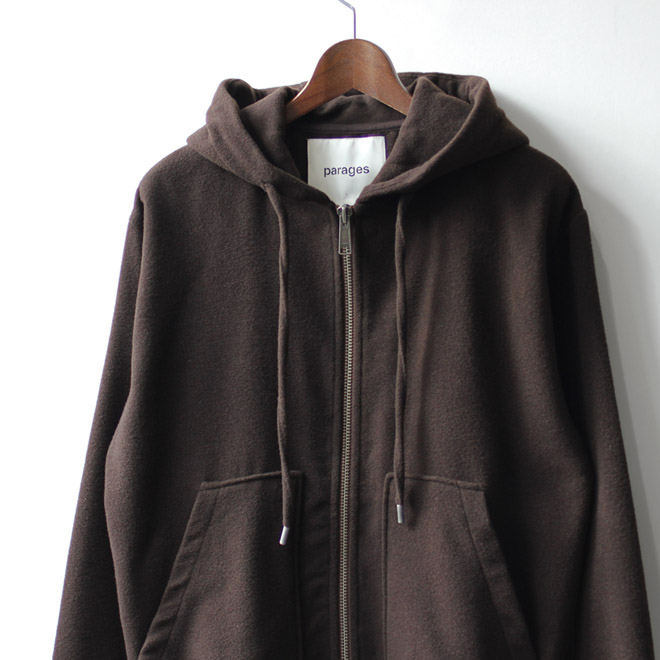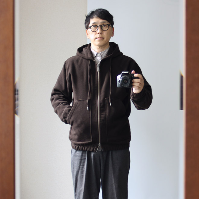 ややゆったりしたシルエットにフーデッド、ダブルジップ、フロントポケット、袖口と裾はシャーリング仕様、シンプルなデザインとディテールです。