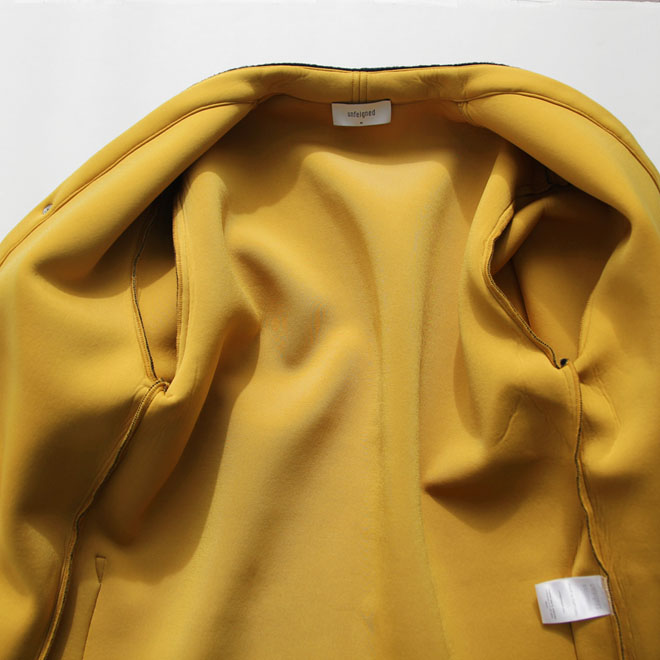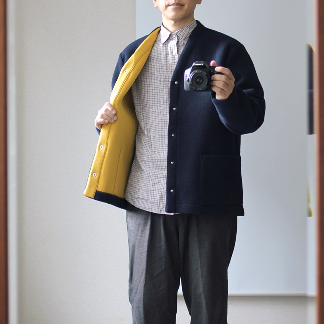 ウールモッサのような起毛感のある縮絨生地を表地として、裏側が目を惹くイエローのネオプレン素材。
