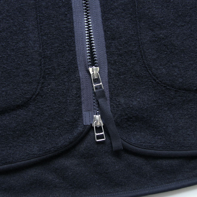ウールフリースならではの軽さと保温性、また天然のストレッチでストレスのない着心地が特徴です。カーディガンのような感覚で気軽に使いまわしていけるユーティリティアイテムです。