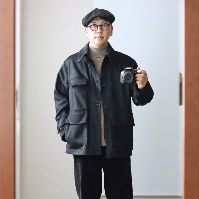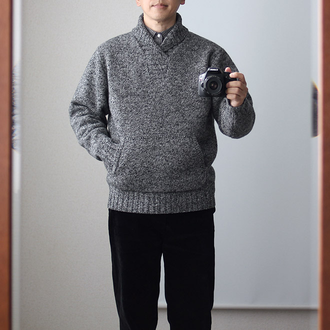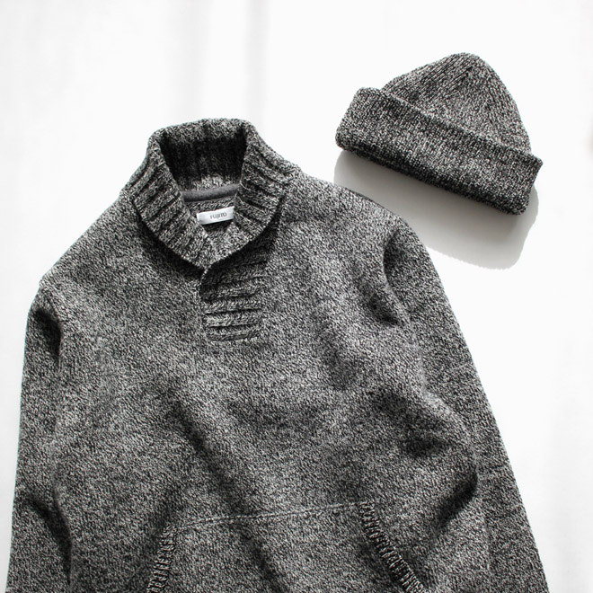 まずは FUJITO のショールカラーセーターとニットキャップ。同じニット地を使っています。