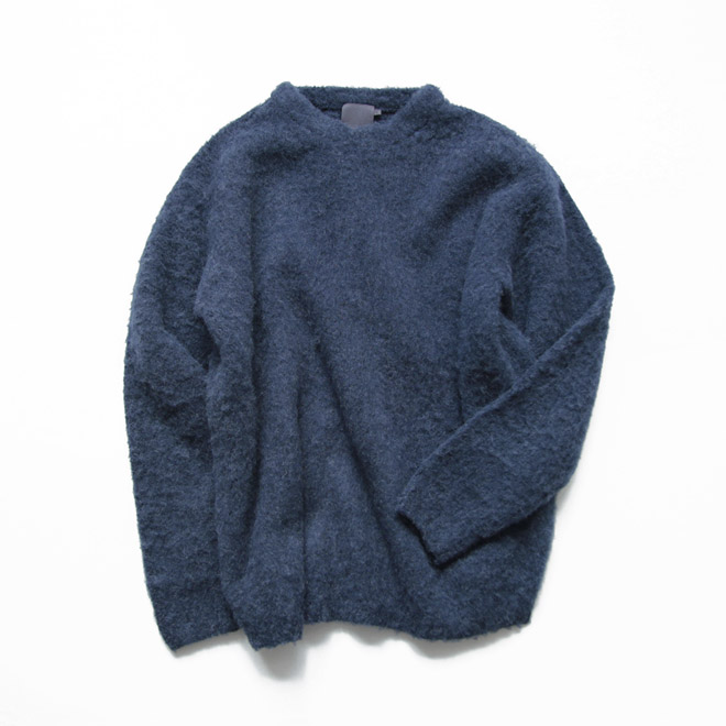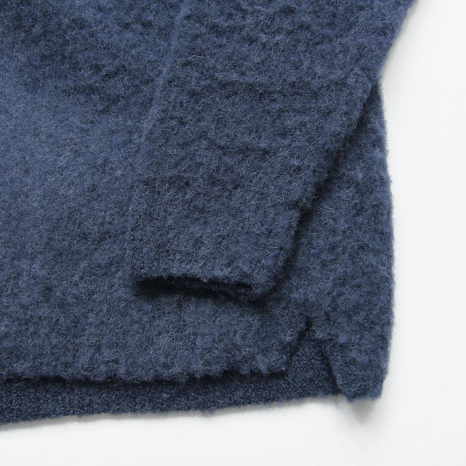 アルパカならではの毛足の長さと柔らかさは、モチモチとした柔らかな弾力として感じられ、シャギーによって空気を孕み、柔らかくて軽い空気感を感じるニット生地となっています。