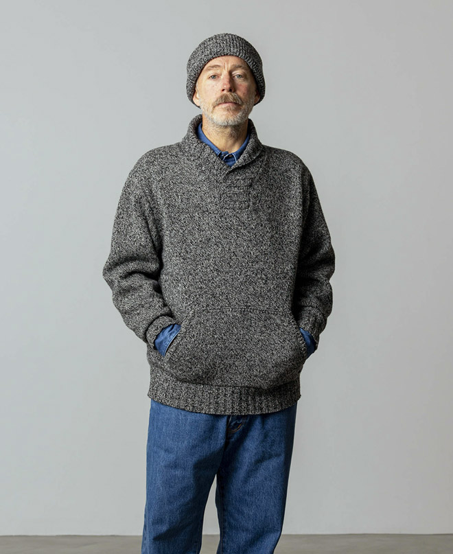 厚手ローゲージでざっくり感のあるニットですが、シェットランドウールとメリノウールを混紡した毛糸が使われ、ルックスと反して軽さと肌触りの好さを兼ね備えています。