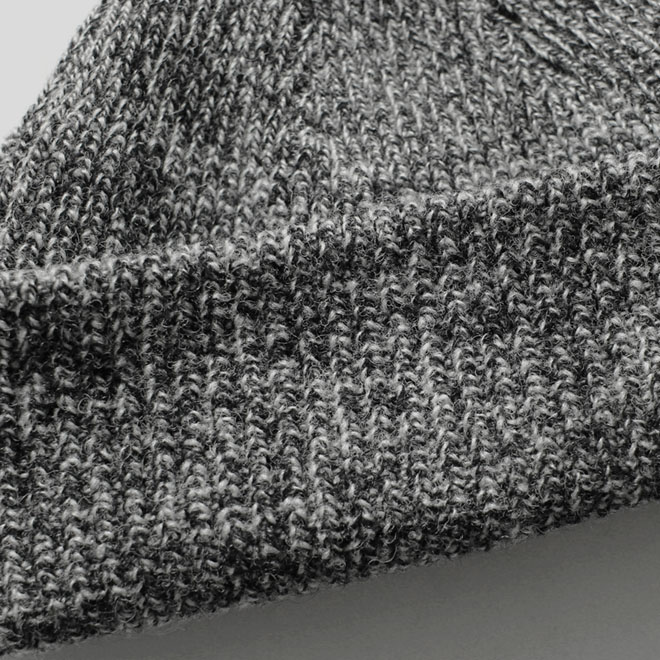 シンプルな折り返しのニット帽ですが、ミックス糸による杢調のカラーが着こなしのアクセントになります。
