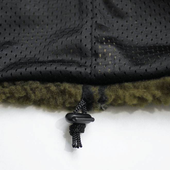 ポリエステルメッシュの裏地が付き、フロントファスナーはダブルジップ仕様、裾に絞れるコード付き、襟口はややコンパクトに設定され、襟を立てた際の防寒性を高めています。