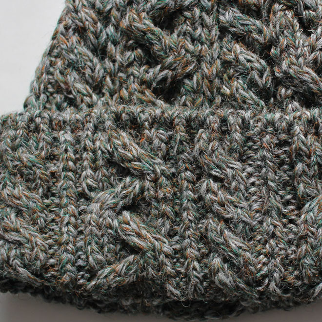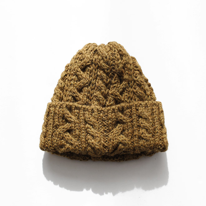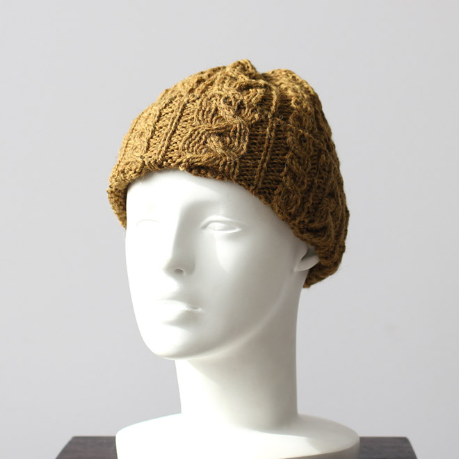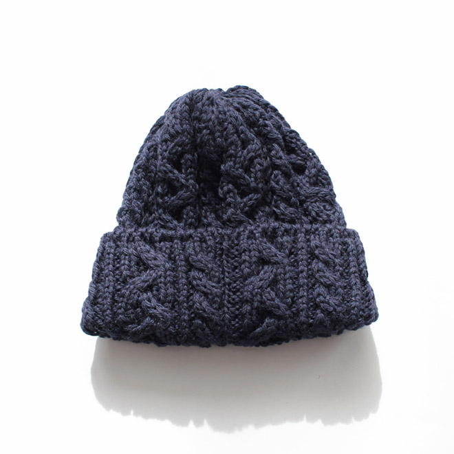 素材はブリティッシュウールです。ケーブル編み、浅めのニットキャップ。