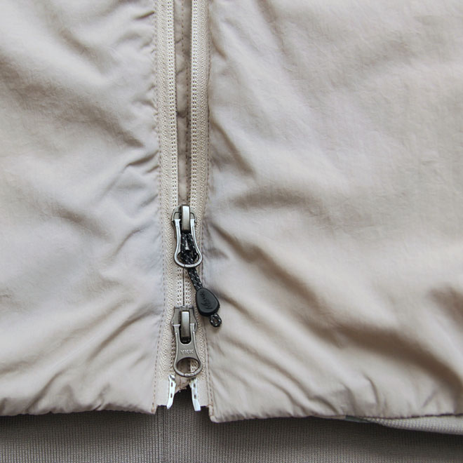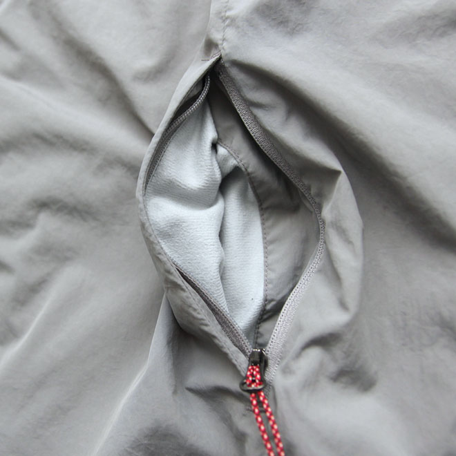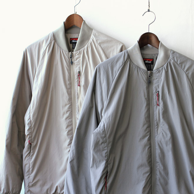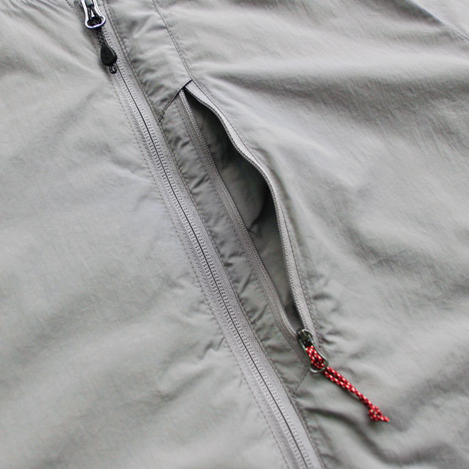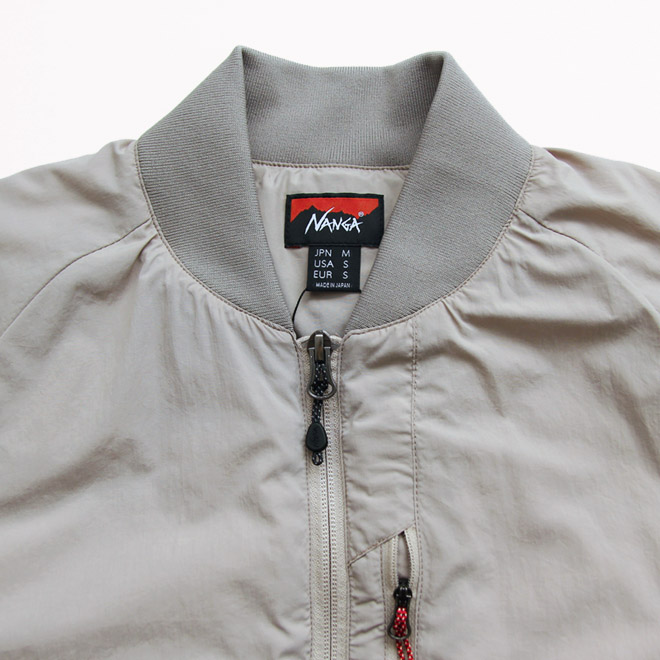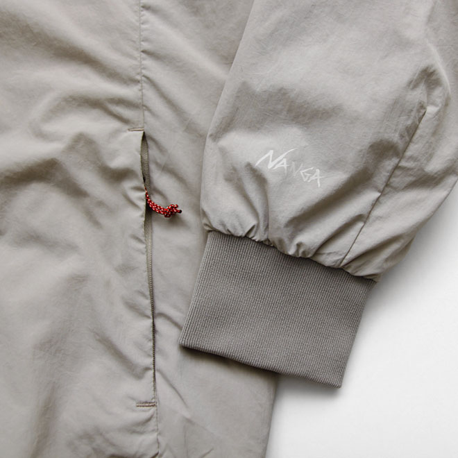 表地はワッシャー加工によって細かなシワ感を持たせた薄地軽量の撥水ナイロン生地が使用され、撥水性能とジャケットそのものの軽さが特徴になっています。