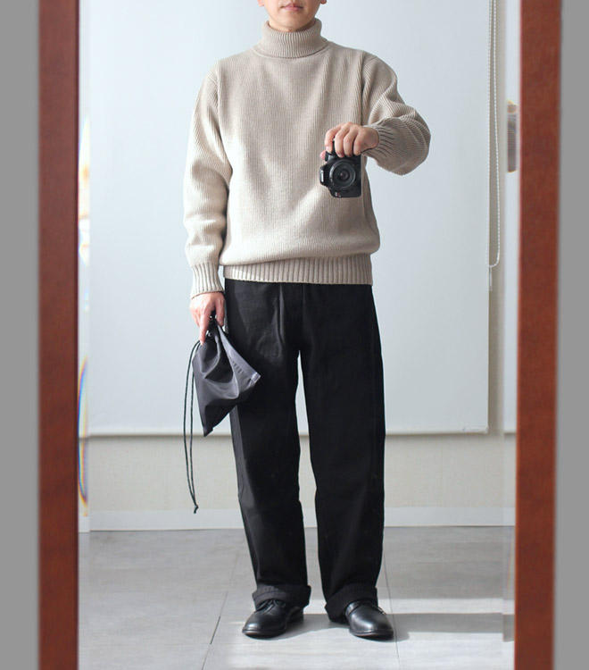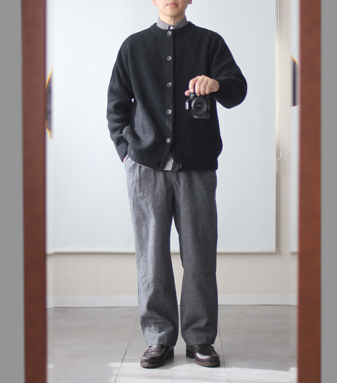 ざっくり羽織るヤーモのコートでルーズシルエットのコーディネイト。インの コム・アーチの厚手ニットはマイサイズが売り切れていたのでワンサイズアップですが、悪くないオーバーサイズ感です。