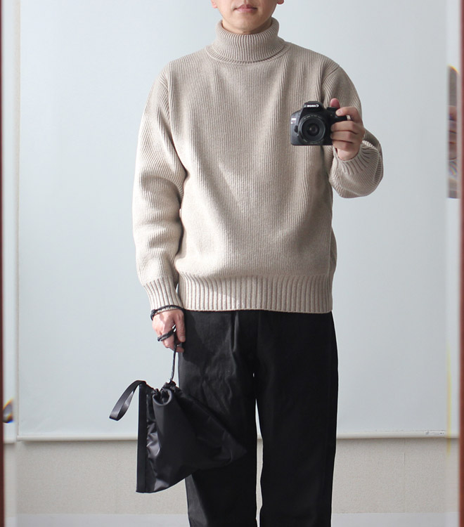 comm.arch. のタートルネックはさりげなくコーディネイトを支えてくれます。