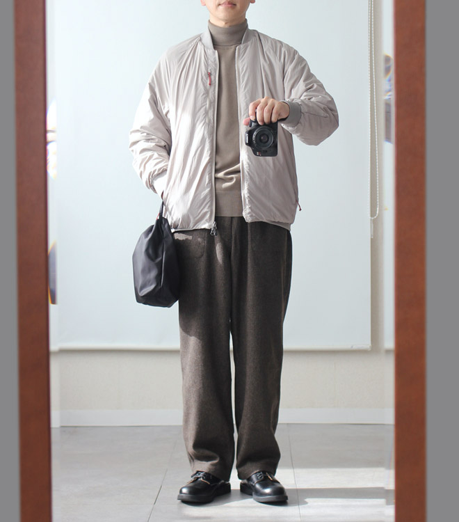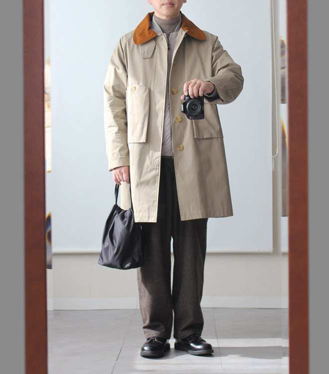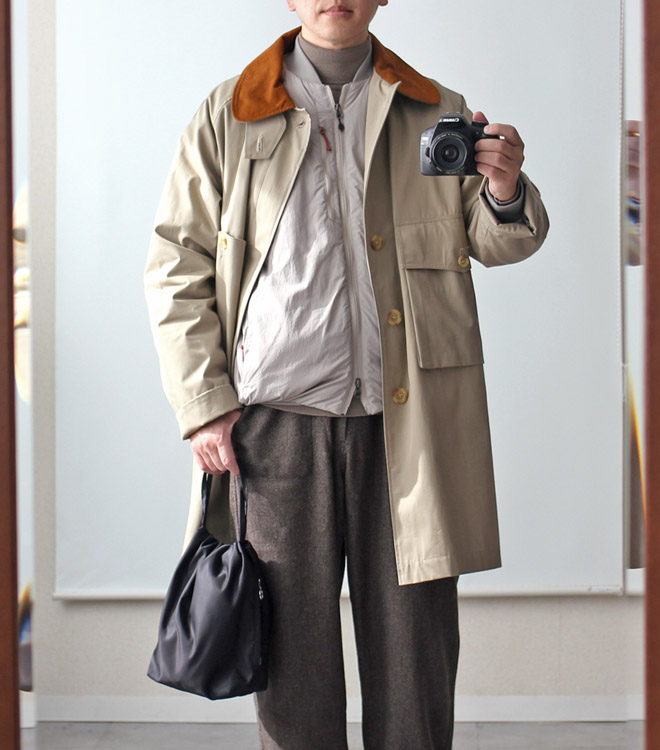 インナーダウンとしてナンガのブルゾンを入れれば、真冬対応。気温に応じてコートを脱いだり、ダウンを脱いだりで、春と秋も名コンビでいけそうです。