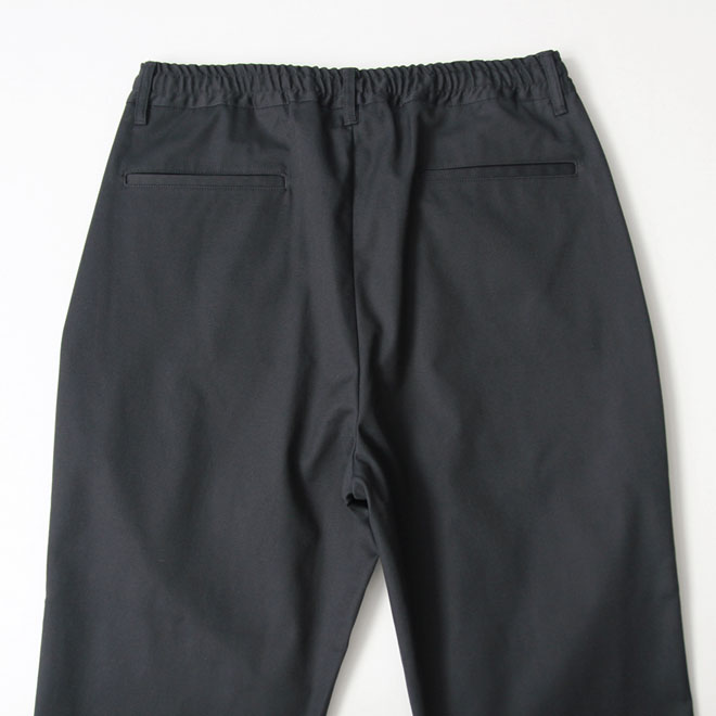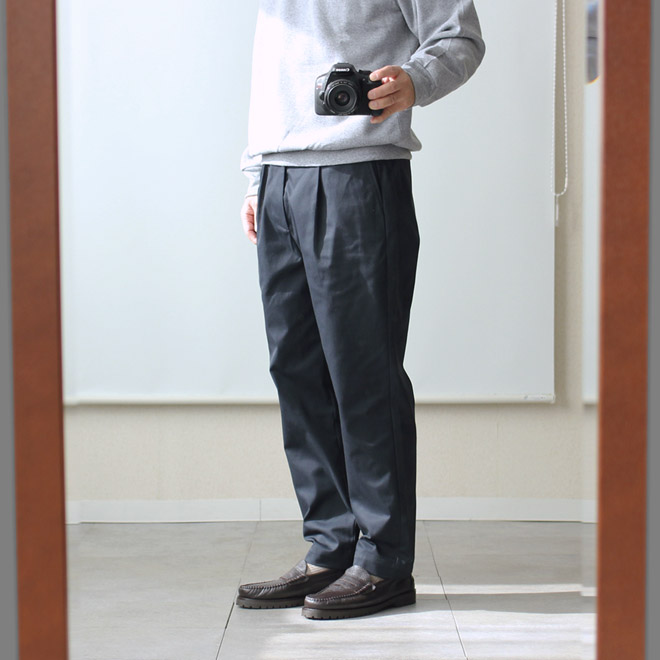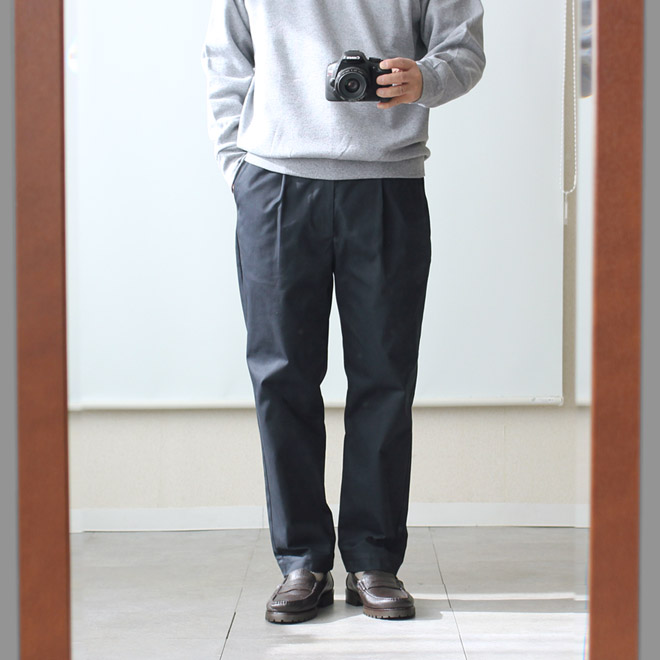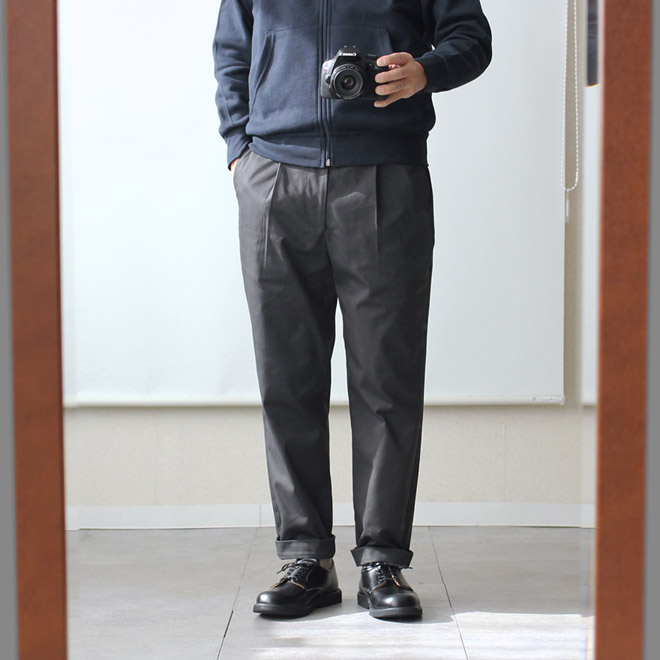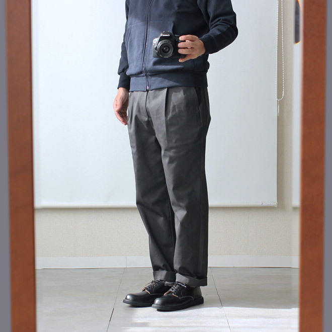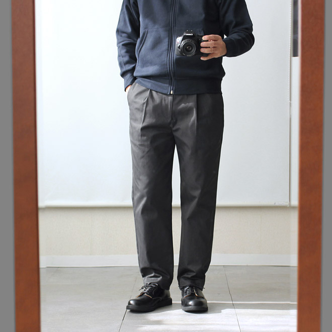 太さは適度なゆったり感を持ちつつ、裾に向かって細くなるテーパードが利いて、全体としてはすっきりとしたシルエット。レングスはジャストから 9.5分丈程度のやや短めの設定です。