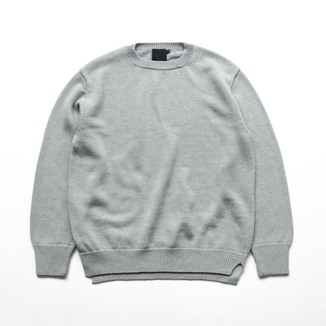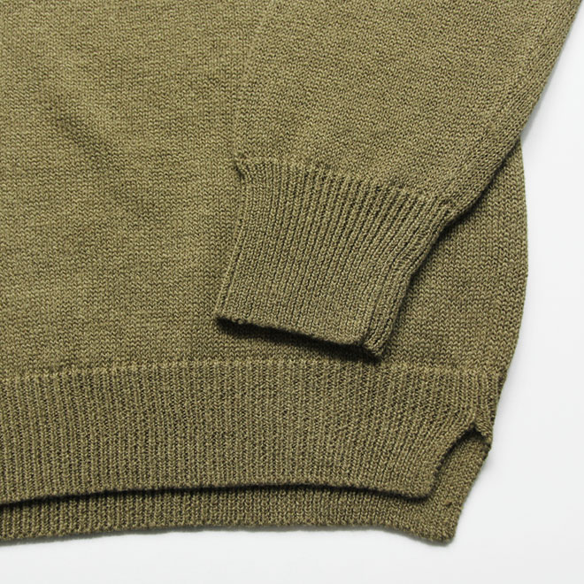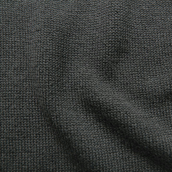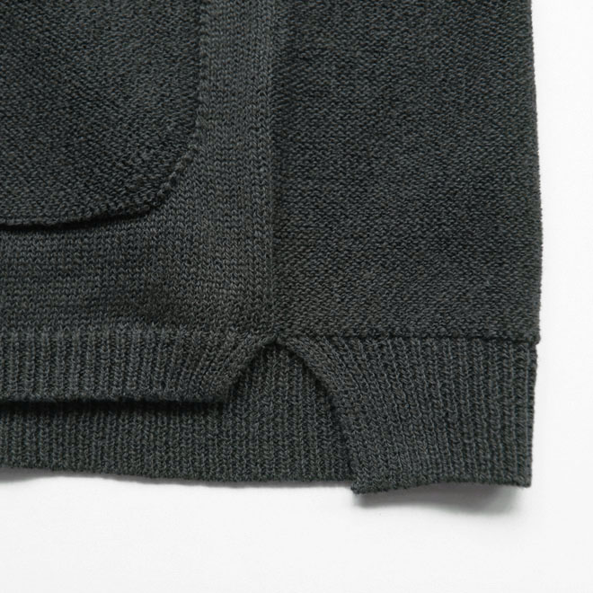 ミドルゲージの中厚地となり、前身頃は表側、袖、ポケット、後身頃は裏側、と編地の表裏両面を使い、わずかながらも変化を加えています。